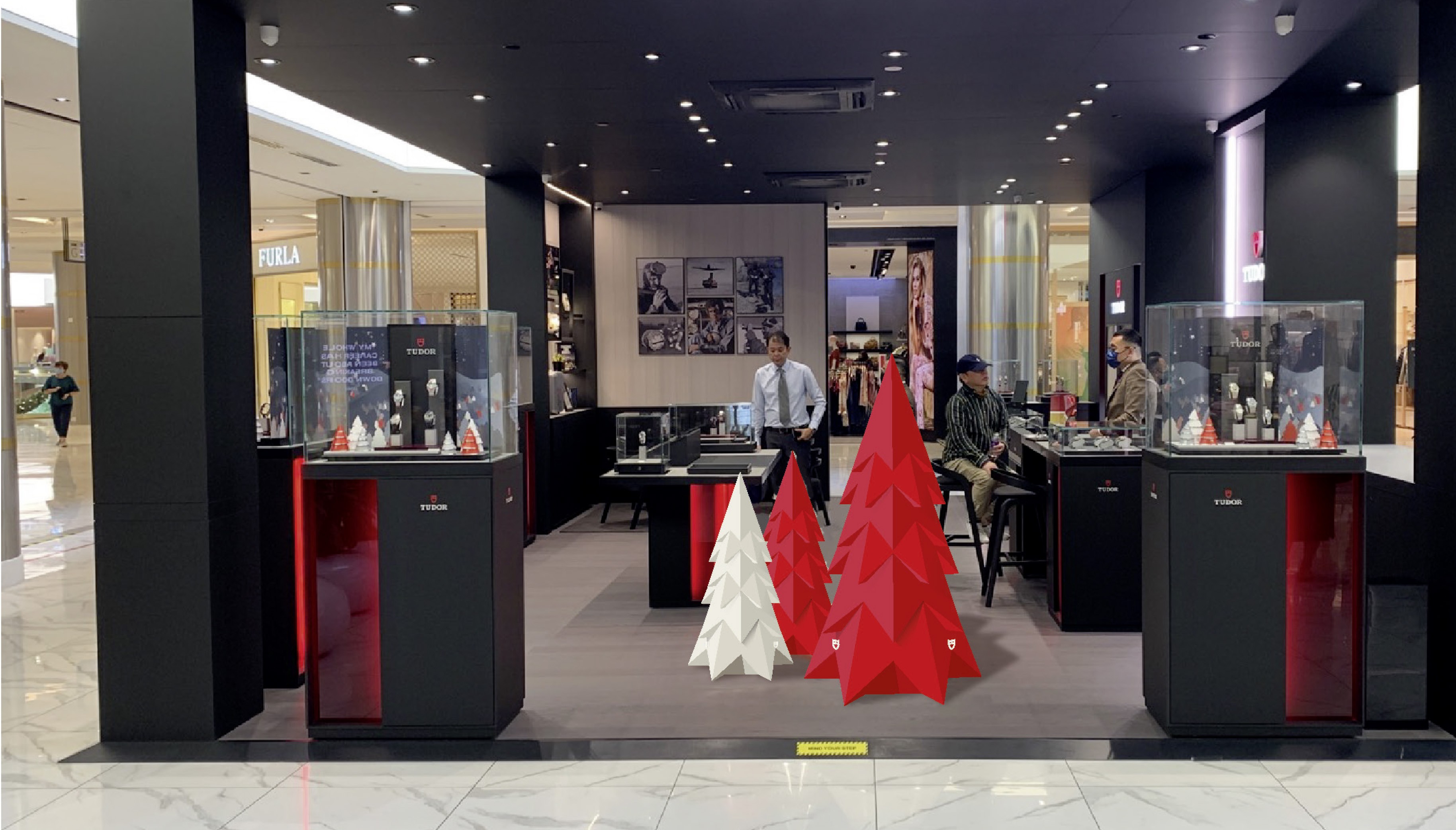 Habillage et animation des vitrines de Noël de l'enseigne Tudor, horloger de prestige.